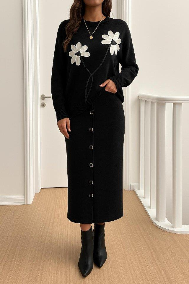 Kadın Bluz çiçek Desenli Detay Etek Düğme Detayıkılı Takım