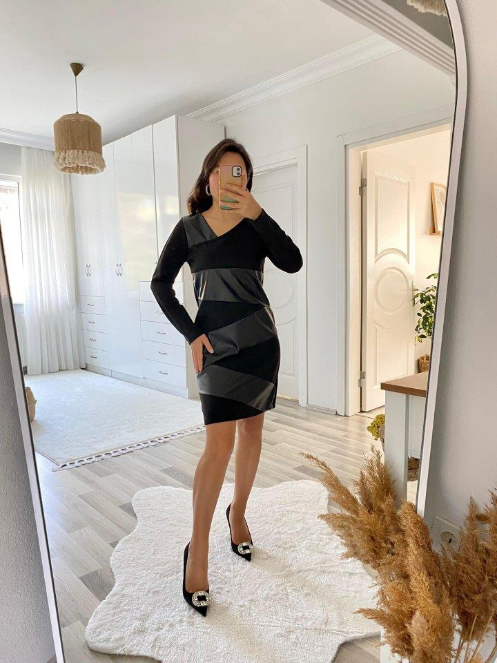 Kadın Uzun Kollu Asimetrik Yaka Süet Ve Deri Mini Boy Elbise