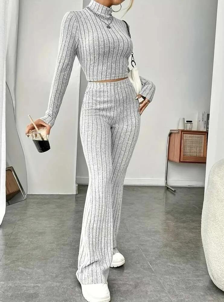 Kadın Uzun Kollu Balıkçı Yaka Krop Ve Pantolon şardonlu Kaşkorse Ikili Takım