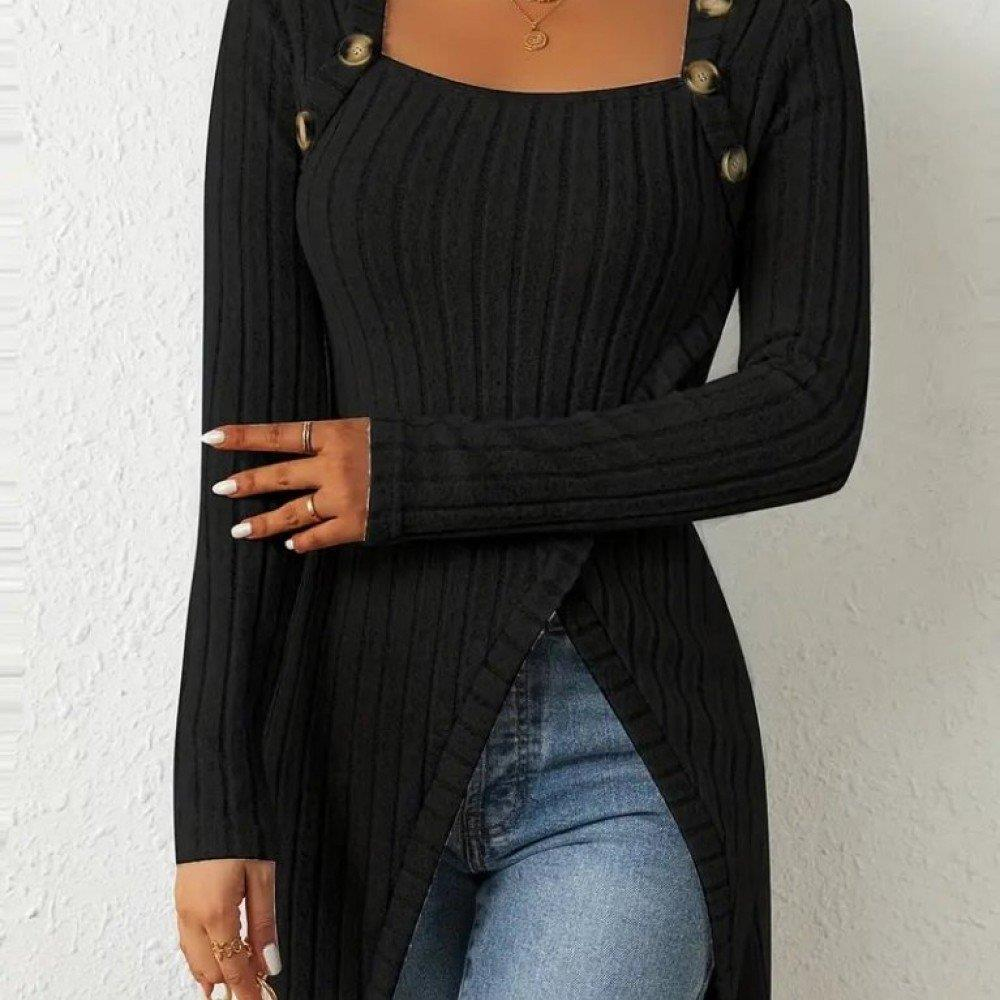 Kadın Uzun Kollu Derin Kare Yaka Düğme Detay şardonlu Kaşkorse Kruvaze Bluz