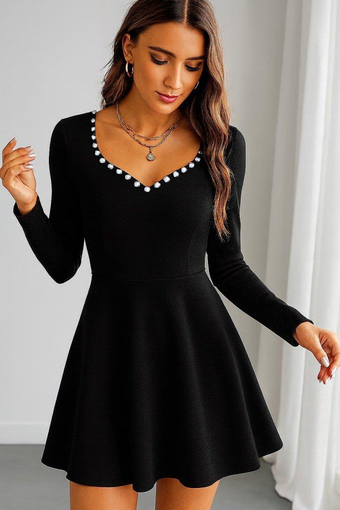 Kadın Uzun Kollu Inci Yakalı Kısa Ithal Krep Elbise