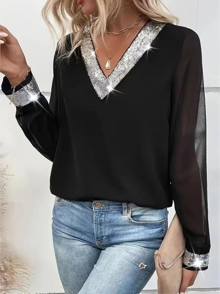 Kadın Uzun Kollu V Pulpayet Yakalı Ithal Krep Bluz